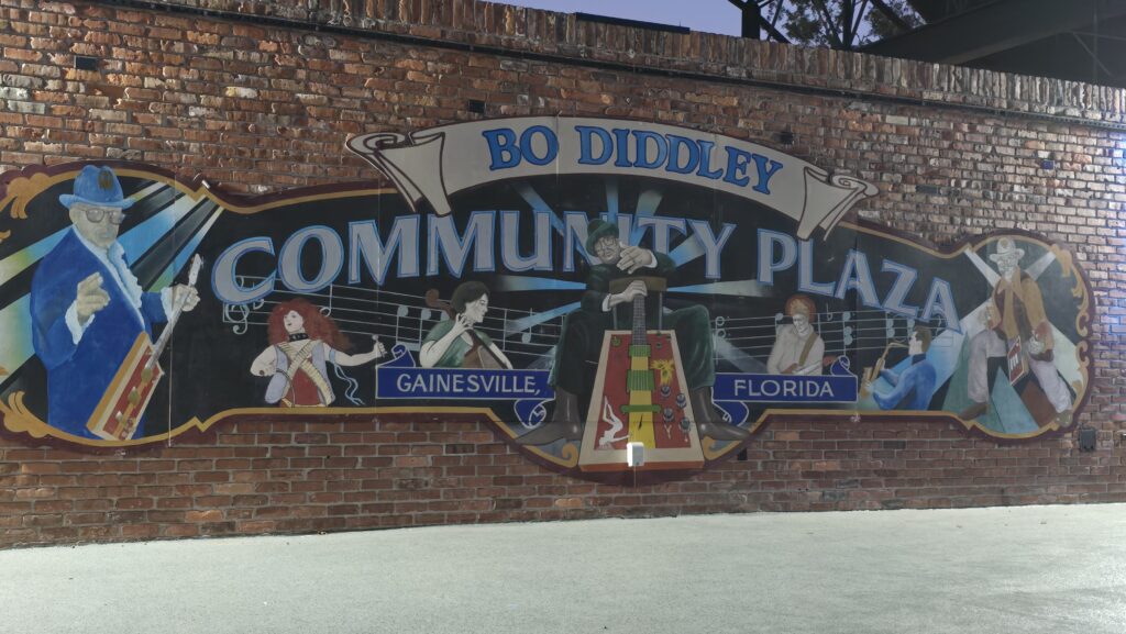 Gainesville on pienehkö (150.000 asukasta) pohjois-Floridalainen kaupunki, joka on Floridan Yliopiston eläinlääketieteenlaitoksen (Veterinarian Hospitalin vieressä hauskasti VA Hospital, eli sotaveteraanien sairaala) lisäksi tunnettu Bo Diddleyn ja Tom Pettyn kotikaupunkina. Keskustasta löytyikin paikallinen ”espan lava”, Bo Diddley Plaza, Tom Pettystä ei näkynyt merkkejä…