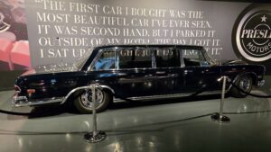 Jossain kohtaa kävimme syömässä Vernon’s Smokehouse -ravintolassa. Ribsit olivat hyviä, brisketti, kana ja pulled pork ei niinkään. Ruokailun jälkeen kiersimme parit myymälät ja kierroksen päätteeksi kävimme vielä tutustumassa Elviksen vuonna 1975 ostamaan ” Lisa Marie”:ksi nimettyyn Convair 880 lentokoneeseen. Kone oli Delta-yhtiön vanha ja Elvis maksoi siitä 250.000$. Elvis käytti koneen muutostöihin yli 800.000$ ja koneeseen rakennettiin olohuone, neukkari, makuuhuone, pari kylpyhuonetta (joissa 24-karaatin kullatut altaat ja hanat), parturi ja satelliittipuhelin. Turvavöiden soljet oli tietenkin myös kullattu… Elvis hankki ”Lisa Marien” lisäksi myös neljä muuta lentokonetta., joiden sivuvakainta koristi Elviksen ja Priscillan yhdessä suunnittelema TCB-logo.