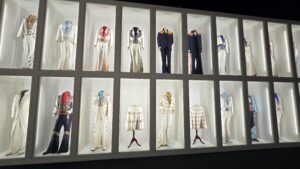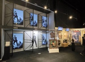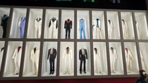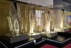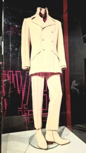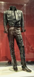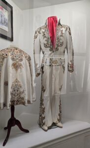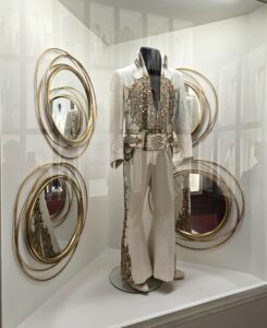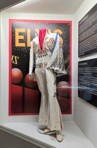 Seuraavaksi esiteltiin Elviksen leffauraa, ’68 Comebackia ja Las Vegasin vuosia. Näytillä oli laitteistoa, soittimia ja esiintymisasuja. Vegas-kauden jumpsuiteihin Elvikseltä upposi satojatuhansia, sen lisäksi kuittien perusteella Vegasin korukauppiaat rikastuivat Elviksen törsätessä myös koruihin satojatuhansia. Toki myös keikkamäärät (pelkästään Vegasissa yli 630 keikkaa) ja esiintymispalkkiot olivat huikeat. Vuonna 1976 Elvis teki 122 keikkaa 74 kaupungissa ja vuoden 1977 ensimmäisellä puoliskolla 54 keikkaa 49 kaupungissa. Viimeisessä kuvassa (pyöreät peilit) on Elviksen viimeinen esiintymisasu vuodelta 1977, jota Elvis piti viimeisellä keikallaan Indianapolisissa 26.6.1977, siinä vyö on jo vähän pidempi.