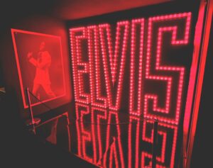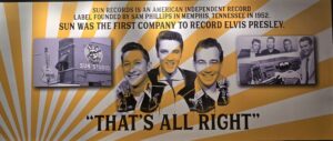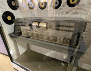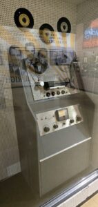 Autoista siirryimme seuraavaan halliin, jossa esiteltiin Elviksen uraa alkaen Sun Studion ajoista. Kuvissa Sun Studion nauhuri ja mikseri, Dewey Phillipsille WHBQ-radioasemalle viety ”That’s all right” -asetaattilevy ja ”That’s All Right”-sinkku (toinen prässätty yksilö).