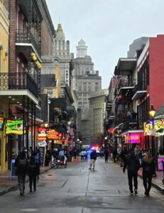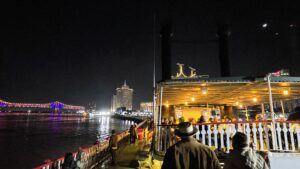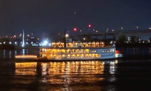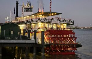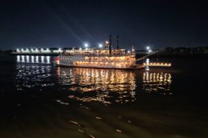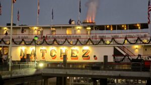 Navigaattori yritti vielä loppumetreillä harhauttaa meitä ja kiersimme turhaan parin korttelin ympäri hotelliamme etsien. Saatuamme hotellihuoneen varasimme liput illallisristeilylle aidolla höyrylaivalla. Kävelimme hotellilta läpi ranskalaisten korttelien Missisippi-joen rantaan, jossa calliope-urkuri alkoi soittaa Natchez-laivan höyrypillejä.
