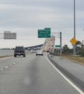 Perjantai-aamuna lähdimme Austinista kohti New Orleansia. Pakottava tarve pitää pari välipäivää baarikaduista aiheutti pienen muutoksen matkasuunnitelmaan ja ohitimme Houstonin ja jatkoimme muutaman tunnin eteenpäin. Pysähdyimme yöpymään Louisianan osavaltion Lake Charlesin resortille Golden Nugget -kasinohotelliin, jonne saavuimme ”romahtamaisillaan olevan” Calcasieu River -sillan (aka Pistol Bridge) yli . Kasinohotelleissa on yleensä hyvä hinta-laatusuhde, eli hotellihuoneet ovat tasoonsa nähden edullisia, koska ansaintalogiikka perustuu uhkapeleihin. Niihin olikin hyvä mahdollisuus, kun valittavissa oli 1600 peliautomaattia ja kymmeniä blackjack-, ruletti, baccarat- ja mitälie pelipöytiä. Hotellissa oli kylpylä, valtava allasalue ja huoneestamme oli parkkihallin seinän sijaan hieno järvi/jokinäkymä 🙂 Casinot ovat laillisia muutamissa osavaltion kunnissa, yleensä joko intiaanien ylläpitäminä kiinteällä maalla, tai jokilaivoilla. Golden Nuggetkin on aikaisemmin ollut jokilaiva-kasino ja siirtynyt lakimuutoksen jälkeen kuivalle maalle.
