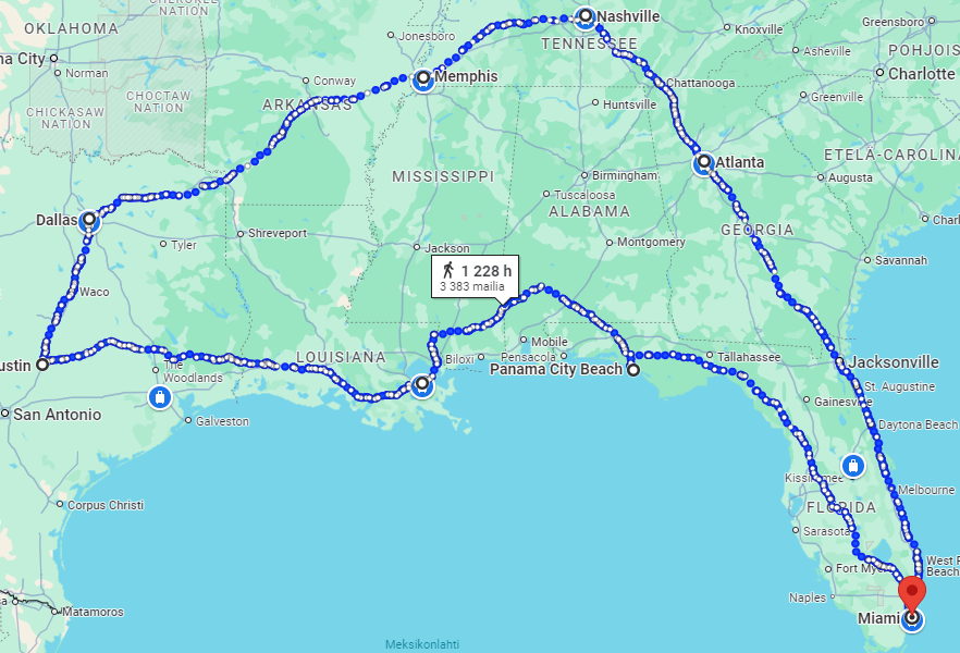 Miami, Atlanta, Nashville, Memphis, Dallas, Austin, Houston, New Orleans, Tallahassee… Jos haluat kuulla kokemuksia mm. näistä paikoista, olet tullut oikeaan paikkaan! Reissu alkaa joulukuun puolivälissä ja silloin alkaa blogiin tulla sisältöä. Ennen sitä vähän perustietoa: